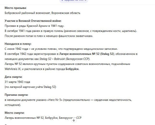 У родственников был документ, что "пропал без вести", предположительно на территории Белоруссии. Позже добавилась справка, что был военнопленным и без подробностей. А тут благодаря ChatGPT, я не вставая с кресла, спустя 82 года и могилу нашла.