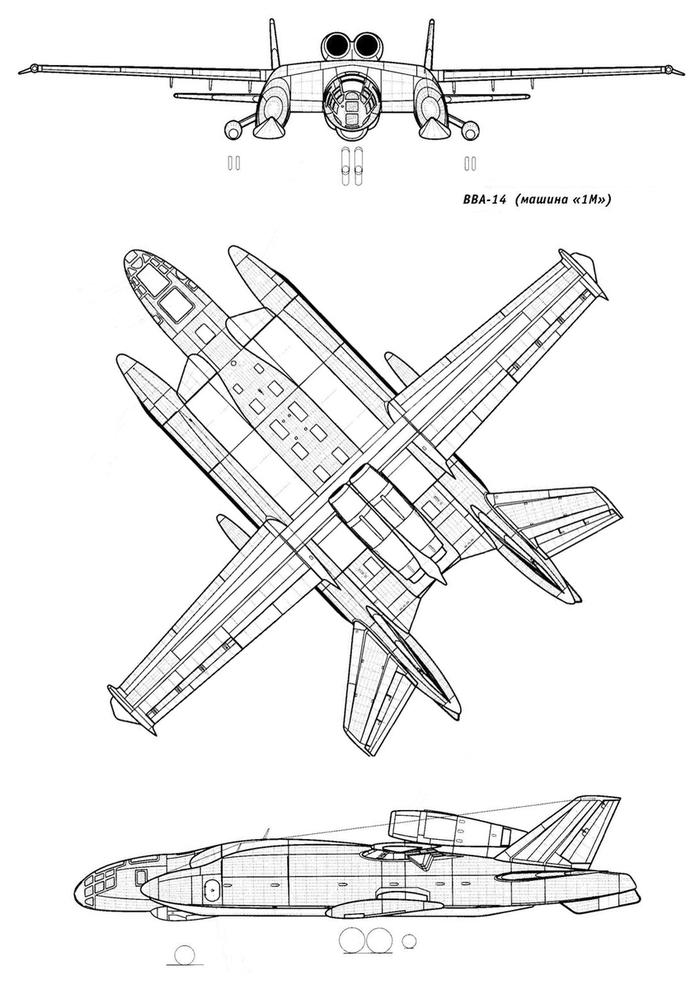 Первый опытный образец ВВА-14 под индексом 1М был готов в 1972 году. Он не имел подъемных двигателей, которые еще только разрабатывались, поэтому предназначался для испытаний исключительно связанных с горизонтальным полетом.