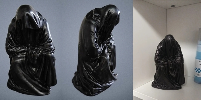 Фигурка Мрачного Жнеца высотой 14 см, в капюшоне, сидящего и смотрящего вниз. Смерть в качестве вымышленного образа встречается в мифах и легендах всех мировых культур начиная с незапамятных времён. Так как изначально человек не мог объяснить причину смерти живого существа, то бытовали представления о смерти, как о реальном существе. В европейской (и, в частности, славянской) культуре смерть часто изображается в виде скелета (или старухи) с косой, облачённого в белый или чёрный балахон с капюшоном (англ. Grim Reaper — «Мрачный жнец»). Ссылка на статуэтку