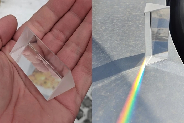 Треугольная призма 3x3x6 см. Призма демонстрирует дисперсию света, преломляя лучи разной длины волны (разного цвета) под разными углами, разделяя белый свет на спектр. Ссылка на призму