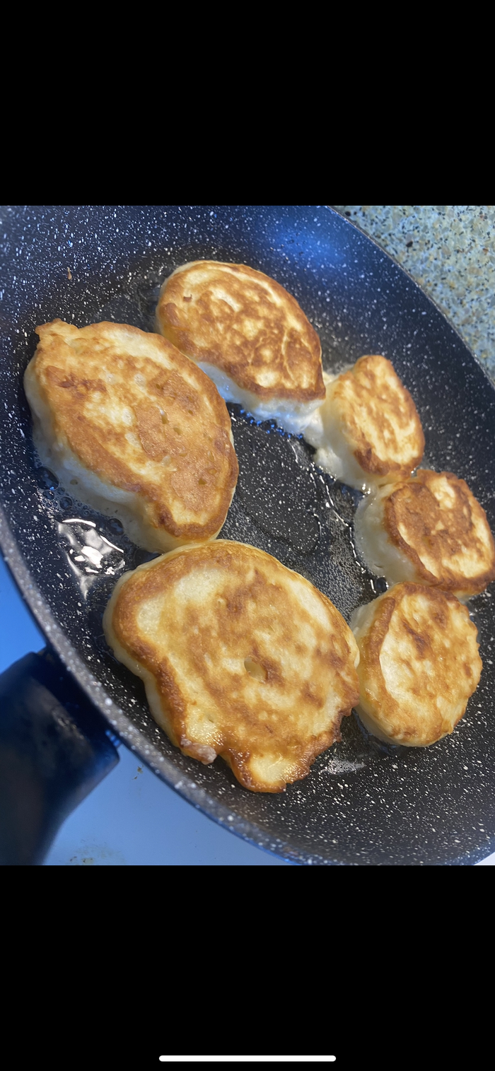 Ложкой выкладываем тесто, слегка расплющиваем кружочки. Между оладьями держим дистанцию.