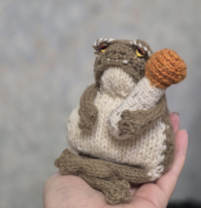 Вяжу новых, толстых, жадных шерстяных жаб. Мадам получилась крайне упитанная. Наверное, как и любая жаба, которая душит- ни с кем не делилась и всё хранила под собой. Теперь сидит себе на полочке и радуется своим богатствам, которые накопила.
