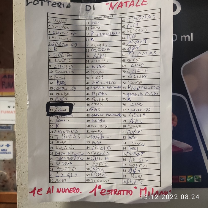 В деревушке, где я живу сейчас, как выяснилось, в баре проводится предрождественская лотерея. Платишь евро и пишешь своё имя в клеточку. Хочешь пять номеров, не проблема, плати 5 евро и вписывайся в пять мест. Хорошо, 2 евро - полтора кофе. Могу себе позволить. Тем более что я кофе в баре пью крайне редко. Изредка покупаю бриошь. Две клеточки. Два любимых номера. 100 клеточек. Бар получает 100 евро. Выигравший - бутыль.