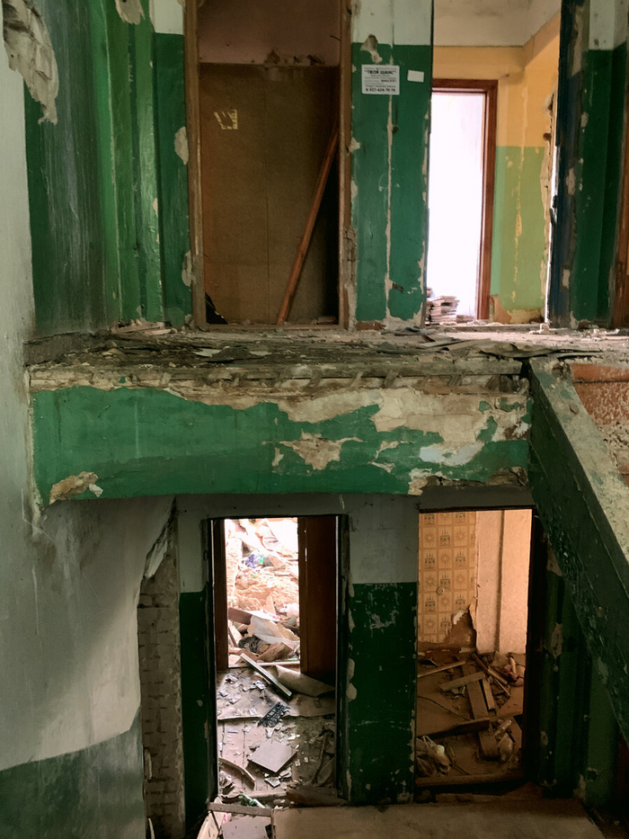 На втором этаже, почти все полы сняты... Прошел две квартиры, хочу зайти в третью и...