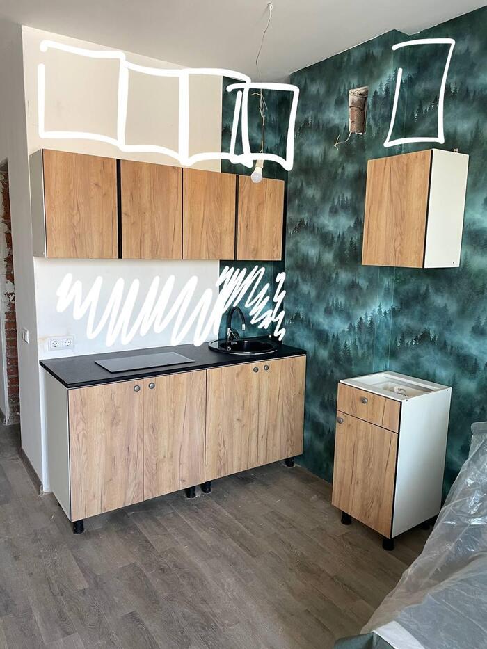 Довольно необычный заказ: девушка купила кухонный набор от Hoff - три нижних модуля, три верхних и столешница. Ей это "смонтировали" (кавычки неспроста - об этом дальше). Посмотрев на результат, она заметила, что над верхними модулями осталось ещё уйма места, и заказала такой же (ага, конечно!) набор, чтобы повесить верхние модули вторым ярусом, а нижние использовать как отдельные тумбочки - одну из них даже приспособив под раковину в санузле.