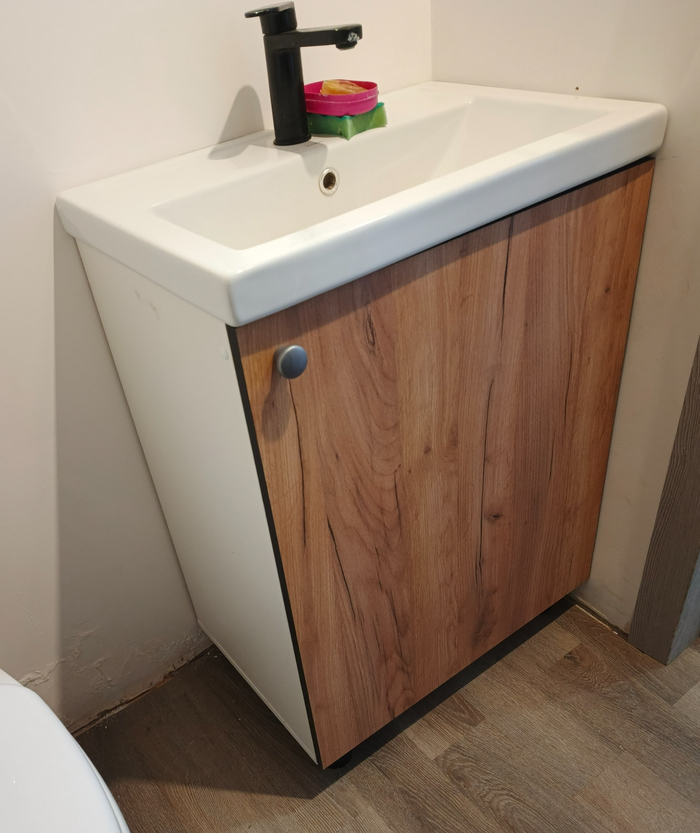 Во-вторых, переделывать и доделывать за другими всегда долго, да и на ходу нужно было верхние модули адаптировать. Ну и пришлось повозиться с тумбой под раковину - подпилил по глубине, укоротил ножки, установил. Казалось бы, мелочь, а времени отняла немало. Вот, кстати, и она.