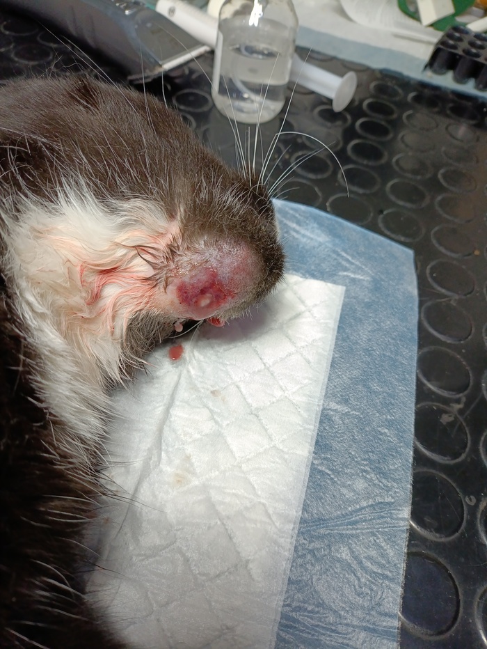 Думали ехать на рентген, очень твердая была штука (у нас уже была кошечка-красавица Тосенька с опухолью в челюсти), но на следующий день она стала более обширной и мы поняли, что это нарвавший абсцесс 🙏