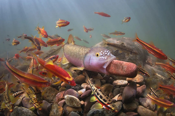Сами рыбки по размеру не велики, всего 12-17 см, но вот их гнезда могут достигать 70 см в диаметре и 13 см в высоту! Вес же всех камней может достигать 40 кг!