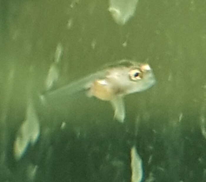Два дня они успешно развивались, вже практически все доели желточный мешок в основном поплыли по всему аквариуму. Я закупил инфузорию, нематоду и гриндаля для дальнейшего кормления. Но все оказалось напрасно, малек не выдержал то ли частичной подмены воды, то ли еще чего то, но на третий день он практически весь погиб, утром оставалось штук пять , к вечеру один. Он получил имя - Леонардо, как выживший😁 и продолжает бороздить аквартум в одиночестве, правда за 10 дней, как мне кажется почти совсем не вырос. Кормлю пока инфузорией, хотя кормлю громко сказано🤭. Это он: