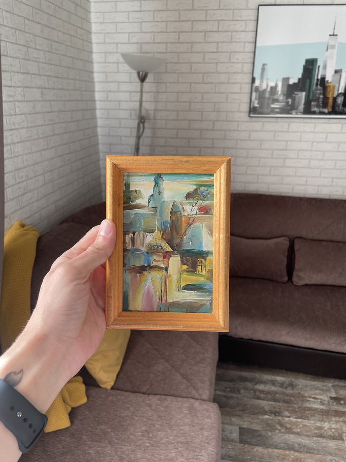 Пока наш друг Миша фотографировал бюсты Радзивиллов, мы с женой и спутницей Миши отправились к торговцам сувенирами. Наш выбор снова пал на картину. Мы выбрали абстрактное изображение Несвижа в исполнении местного художника, который, не смотря на преклонный возраст, уверенно принял оплату, использовав в качестве терминала свой мобильный телефон (40 белрублей, около 1250 российских).