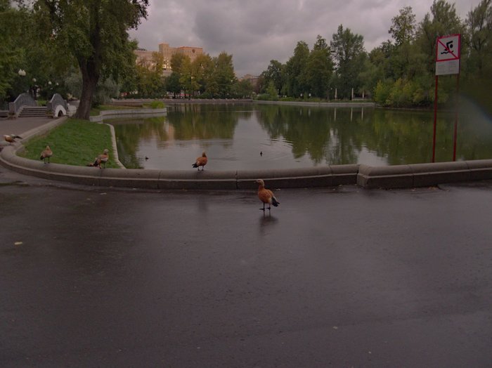 Оттуда — в Нескучный сад. благо он рядом. Очень тихо, пахнет землёй и преющей листвой, запах уже ближе к запаху старого леса осенью. Тишину разрывает только массовая перекличка уток-огарей на одном из прудов парка.