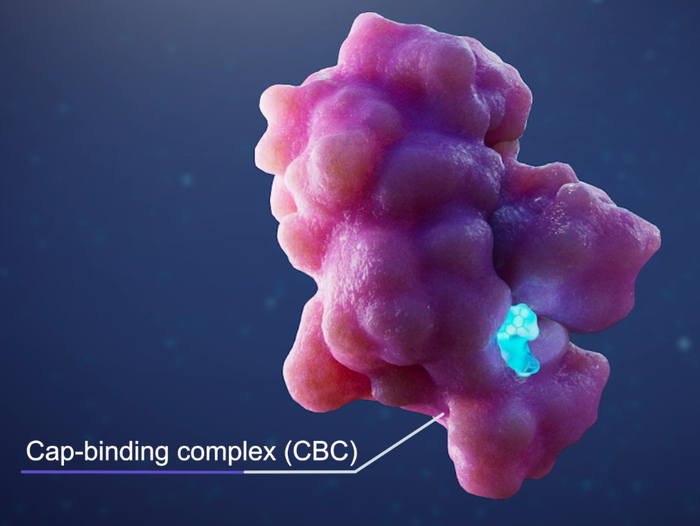 Молекула обефазимода, поступая в организм, связывается с кэп-связывающим комплексом (Cap binding complex, CBC), ответственным за производство микроРНК mir-124 из предшествующей РНК prе-mirRNA: