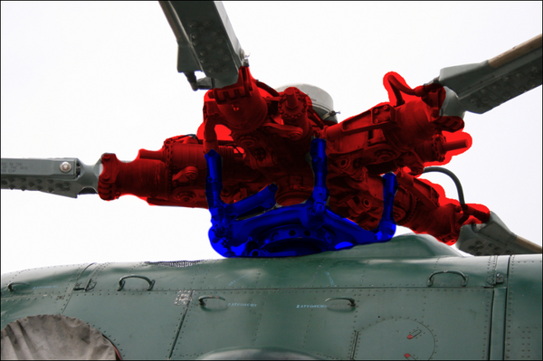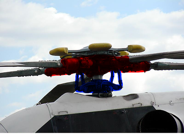 Начнём с того, как это всё выглядит для вертолёта. На следующих картинках красным - втулка несущего винта, синим - автомат перекоса.