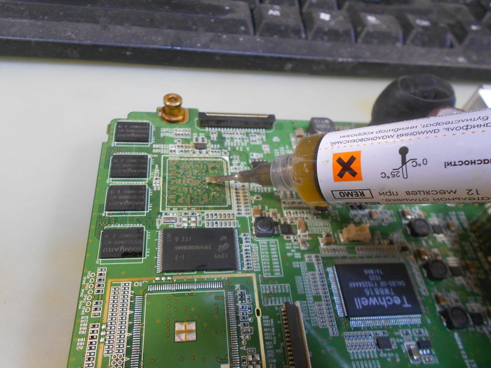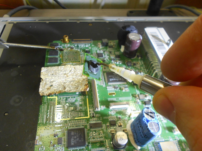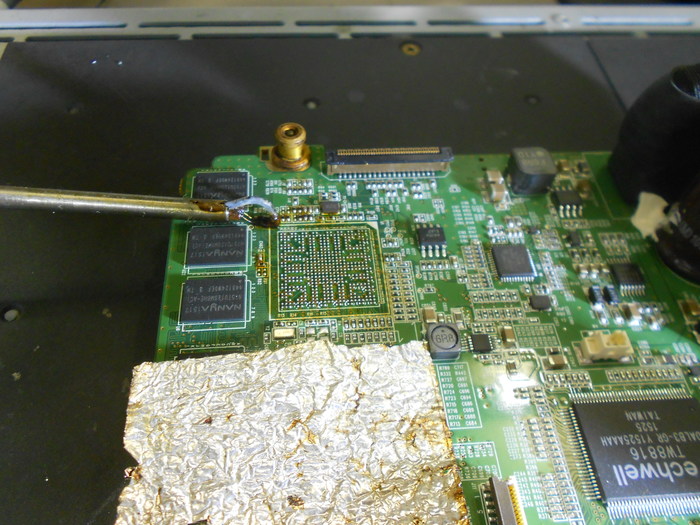 Проблема обнаружилась сразу же при визуальном осмотре видеокарты - сбит smd конденсатор возле разъёма PCI-e. Устанавливаю его на место и заливаю лаком место повреждения.