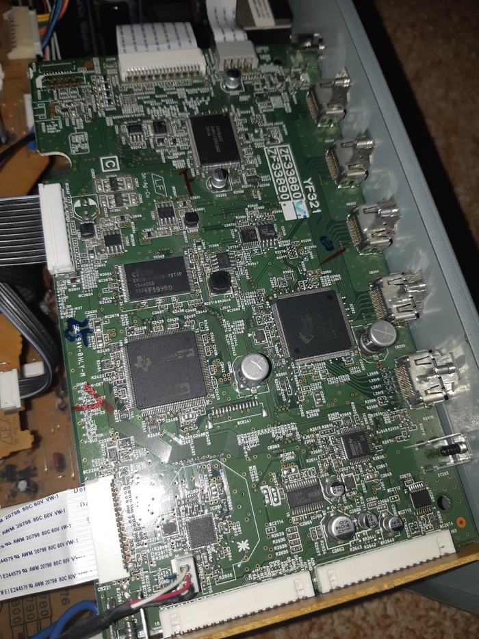 При подключении обогревателя в один удлинитель с техникой, (жена решила погреться:) проскочила искра и сделала дуплет по телевизору Lg и ресиверу Yamaha rx-v375. В телевизоре грохнуло main плату. Удалось найти донора и телевизор был восстановлен. С ресивером проблема : Нет вывода сигнала по HDMI, входы hdmi работают. Остальные функции тоже исправны, av, радио и прочие. HDMI управляется микросхемой sil9573ctuc. Катушки двойные перед разъемом HDMI и соответственно ноги на разъёме звонятся на землю (ну или очень низкое сопротивление, что по идее не должно быть) l2012 в обрыве. Но до нее тоже на земле. Катушку, допустим замычить не проблема. Микросхему нашел на Али. Заменить смогу. Но вот вопрос, - в ней ли дело, нужно ли ее прошивать будет. Никогда с такой техникой дел не имел. Ремонтирую смартфоны. Схемы на этот ресивер найти не смог, только даташит на микруху. Кто сталкивался может с таким?