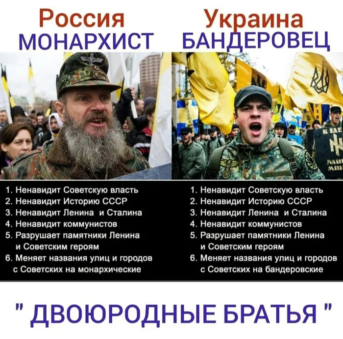 Бандеровец и царебожник двоюродные братья. Как и националисты других мастей. У всех плюс- минус одинаковая мифология об исключительности и богоизбранности "своего народа", его первейшей роли в истории, отцовскости всех остальных народов. Будь то пантюркисты, панфинно-угристы и прочие. И у всех виноваты коммунисты. Везде. Вот только самое интересное, что эти исключительные из исключительных шли на свой же народ с оружием врага в руках и рядах этого самого врага. А весь остальной народ был за коммунистов. Поэтому коммунисты и победили.