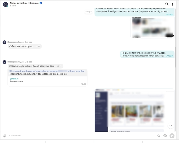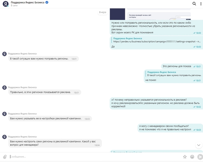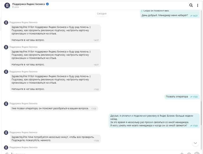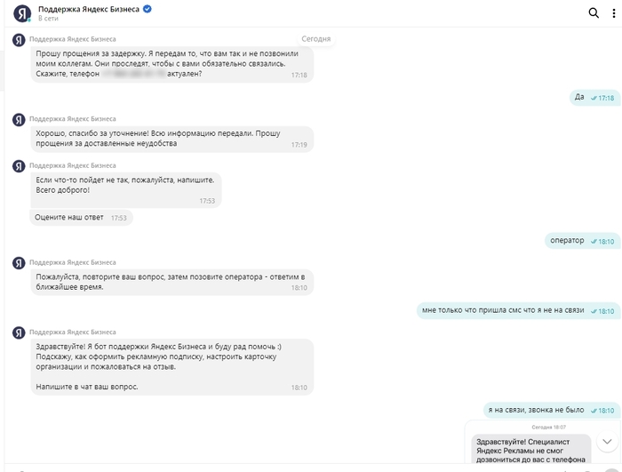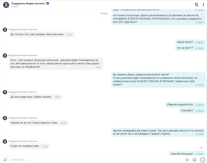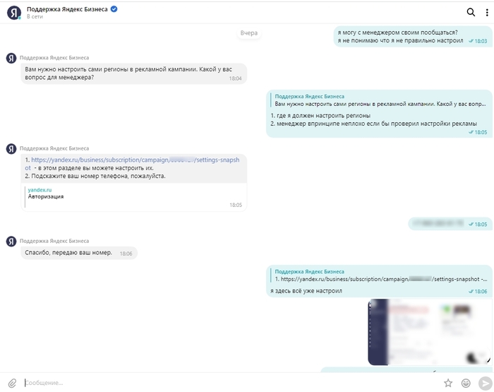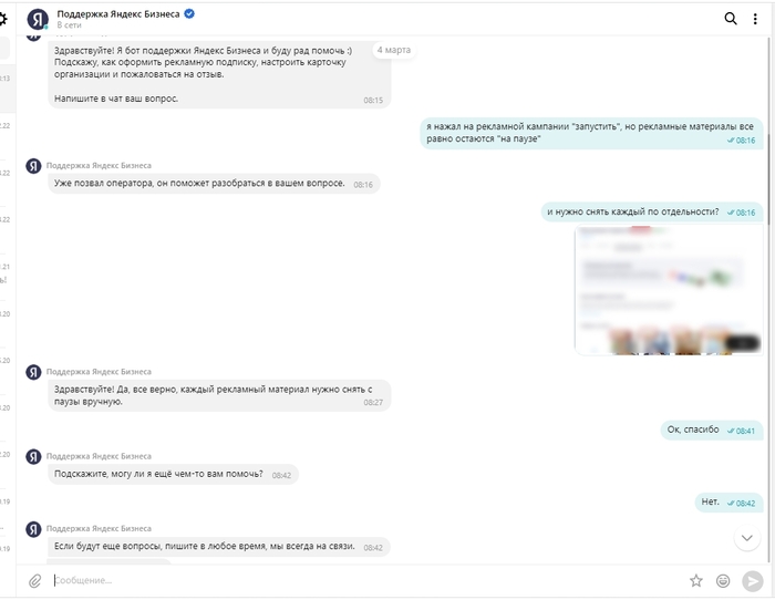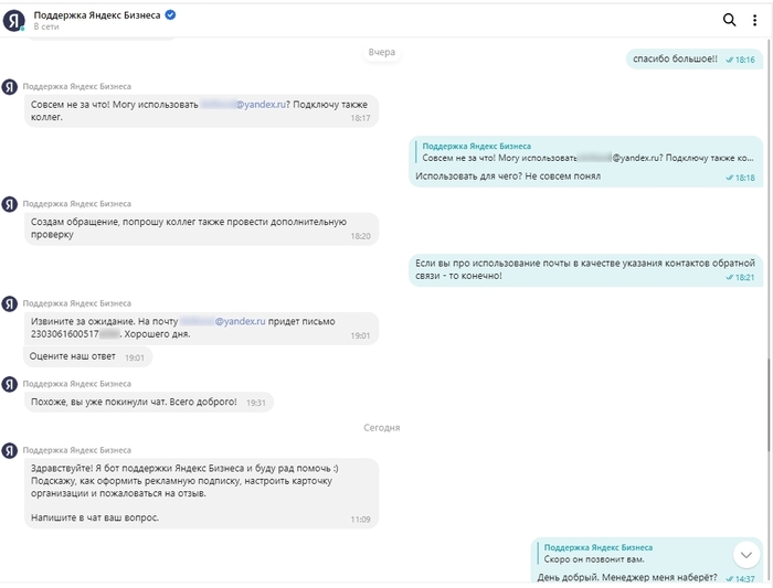 И после этого я решил перенести переписку обратно в чат яндекса, где в теории кроме менеджера который не на связи есть и другие специалисты.