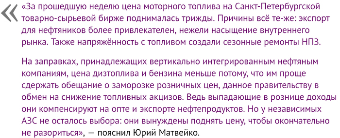 «Акциз — это то, что влияет на цену напрямую. Если его убрать хотя бы в качестве экстренной меры, на зафиксированный срок, скажем, на три месяца, — это незамедлительно скажется на цене на АЗС», — говорит Олег Ашихмин.