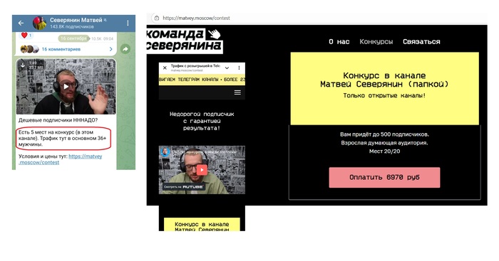 В телеграм-канале Матвея (сейчас там более 143 тыс. подписчиков) и на его сайте был размещен видео-ролик с рекламой конкурса. Там он говорил, что будут разыграны ценные призы, а “в прошлом конкурсе поучаствовали 446 человека”. При этом, якобы трафик у них качественный, взрослая аудитория, и средний возраст подписчика — около 36 лет. По его словам на видео: “у нас хорошие призы, плюс мы призы отдаем”. В видео были показаны коробки с призами, радостные фотографии людей, которые получили различную технику: планшеты, игровые консоли и т.д.