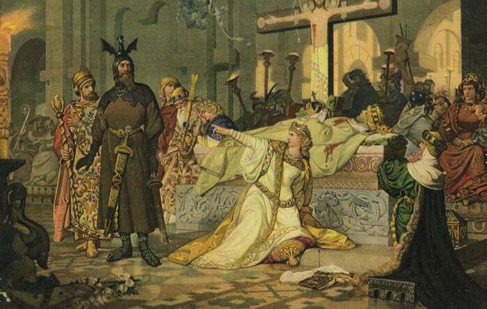 Прибыли нидерландские гости, начались праздники. Все веселятся, мед-пиво пьют. Целых десять дней, а на одиннадцатый королевы сидят, болтают о своем, о девичьем, и Кримхильда говорит: «Смотри, Брунечка, какой у меня муж. Спортсмен-комсомолец-красавец. Не чета твоему замухрышке колченогому». Брунгильда аж ахнула: «Чего это у меня замухрышка? Да мой получше вашего замшелого Зигфрида будет. Гюнтер-то поди король, а твой, ха, вассал! И сама ты – вассалиха!!» Кримхильда возражает, настаивает, ее муж тоже король, к тому же, самый богатый король. Я, говорит, докажу тебе, что королева, когда в церковь пойдем. Напряжение нарастает.