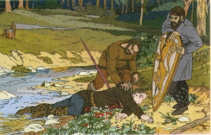 Остальные же граждане заговорщики, решили, ну ее на фиг, эту выдуманную войну с датчанами, давайте лучше на охоту съездим. Зигфриду сказали, что датчане передумали и по такому радостному поводу, поедем в лес, ловить дичь. Тот опять на все согласен. Время провели хорошо, все уже почти забыли, что им еще Зигфрида убить надо, но он сам напомнил - лучше всех стрелял, больше всех поймал. Ну и утомился само собой, запыхался. Просит попить, а ему «ой, мы, головы садовые, забыли и ничего не взяли». Психанул Зигфрид, решил из ручья напиться. Еще на перегонки с Гюнтером побежал из духа соревнований. Поддался тому, конечно, потому что вот такой он был вежливый человек. Собрались у ручья, а Хаген все рядом с Зигфридом крутится, я, говорит, курточку вашу подержу, что б не замокла, копье, щит, начинайте уже, пейте. Разделся Зигфрид до рубахи, наклонился к воде, тут ему Хаген копье в то самое место и тыкнул. Развернулся король, зашатался, ты чего творишь, у Хагена спрашивает и даже попытался того пристукнуть, но не успел – испустил дух. На прощанье, конечно, сказал: «Какие же вы все бургунды, свол…». И умер.