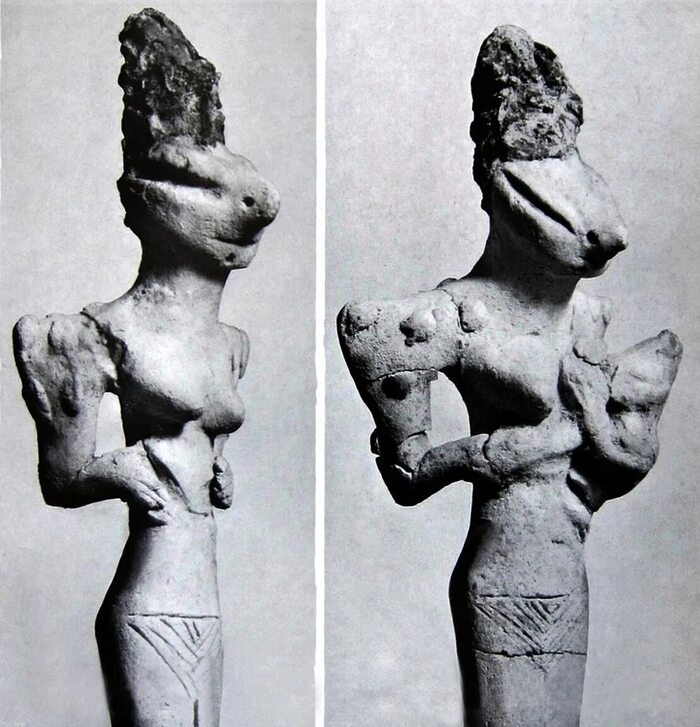 Особенностью этой культуры были статуэтки с головами ящеров и узкими разрезами раскосых глаз. Наиболее известная из них – это человекоподобная ящерица, держащая на руках своего ребенка и кормящая его. Были и другие статуэтки с телом женщины и головой ящерицы. У них на груди и на гениталиях – гравированные треугольники, на плечах – налепы (наплечные украшения), на головах – высокие «шапочки» или парики из битума (природного асфальта).