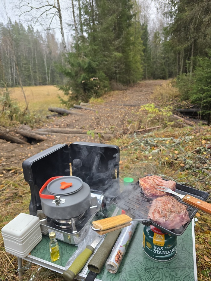 Ну а пока мы искали рыбу, ребята приготовили стейки и чай