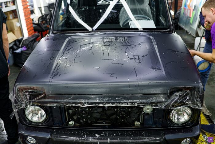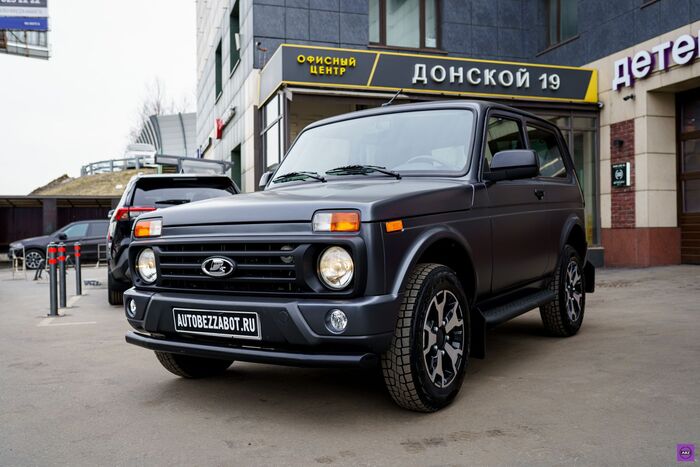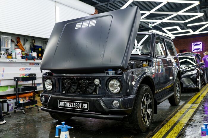 Всю процедуру она перенесла стойко: разбор, подготовка, полное оклеивание матовой полиуретановой плёнкой. Всё по высшему разряду, как будто это не Лада 4x4, а, прости Господи, Range Rover. Кстати, на этапе разбора кто-то в боксе пошутил, что это «урбан-стелс-версия» — потому что выглядела она уже как спецтранспорт для миссий в центре мегаполиса. Без регистрации и SMS.