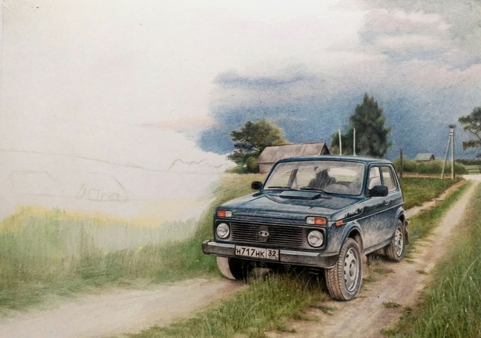 В любом случае рисунок выполнен чисто по воображению, по желанию передать эту атмосферу с деревенским мотивом, получилось ли? Судить вам, единственное что машину я срисовал, но со своими дополнениями в виде грязи и разводов на стеклах.