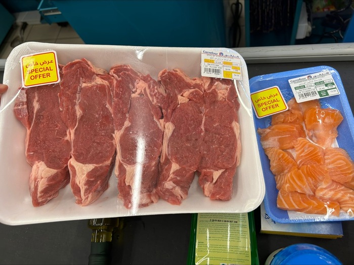 А вот это самое интересное - бразильский стейк из говядины - 1200 за кг. Сёмга типа сашими (?) 2200р. Это уже покупал я.