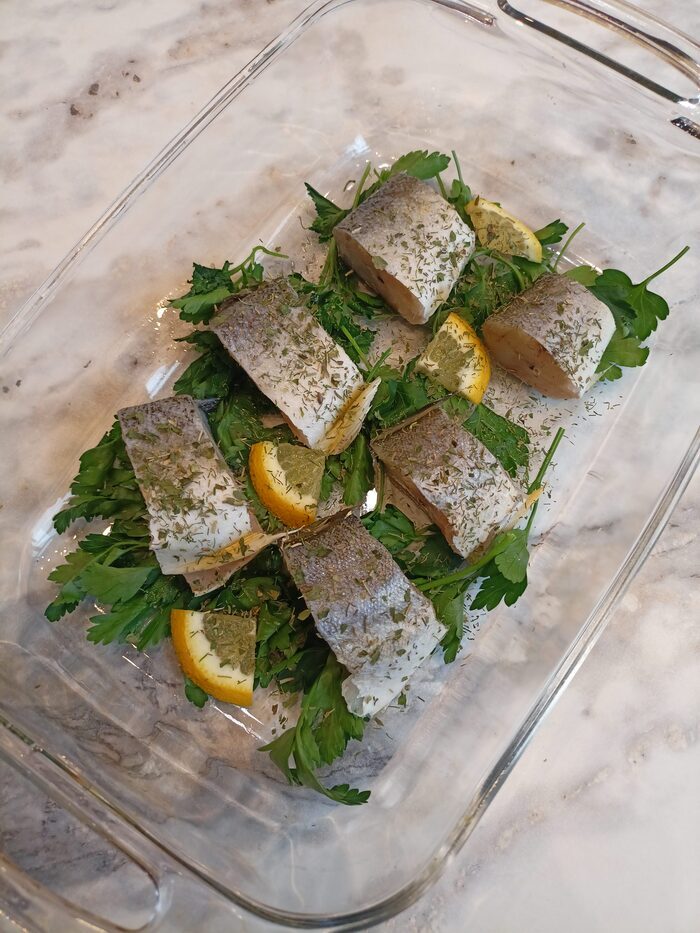 А вот и время ужина подошло.. сегодня это рыбка, у меня будет навага, некрупная, поэтому беру сразу две штучки (нужна будет завтра), нарезаю на кусочки, добавляю лимонный сок, зелень, даю помариноваться 15-20 мин. В форму выкладываю небольшой пучок петрушки, сверху рыбку, накрываю фольгой и в духовку на 20-25 минут.