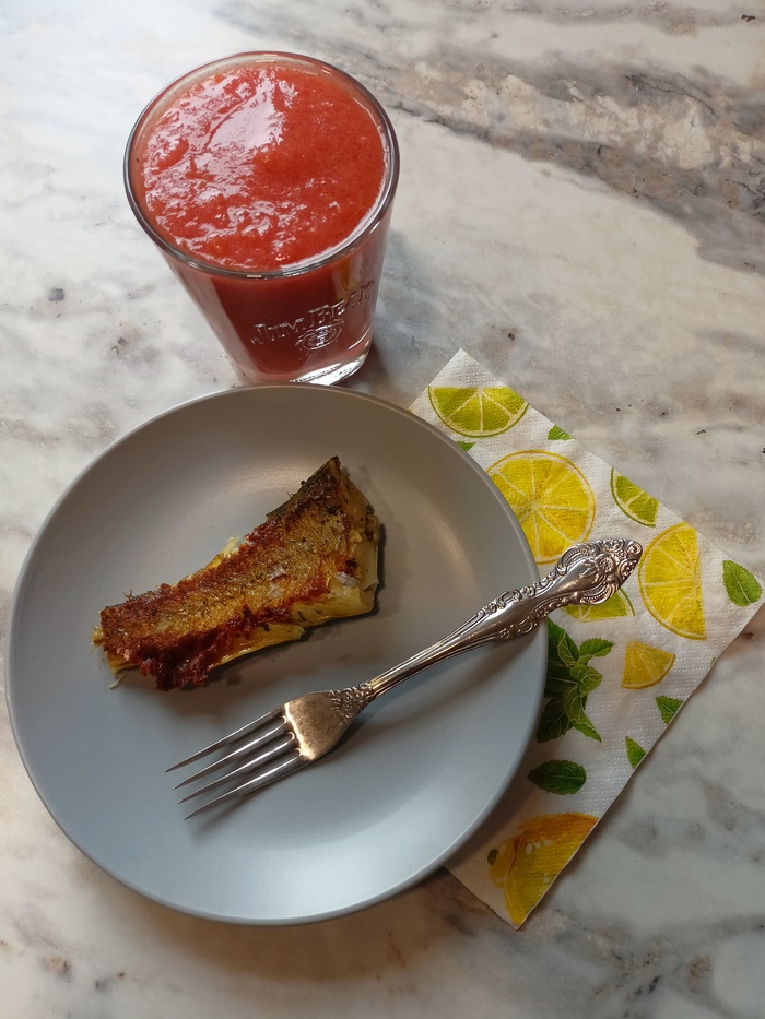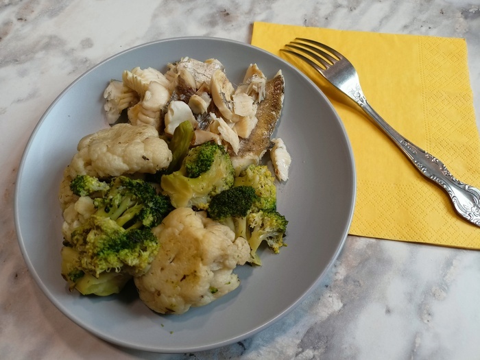 С обедом вышел небольшой косяк - запечённую вчера рыбу, на которую я рассчитывала, слопали другие члены семьи 😁 поэтому при обнаружении пустой тарелки пришлось экстренно отваривать другую порцию рыбы), капуста запечённая оставалась со вчерашнего дня