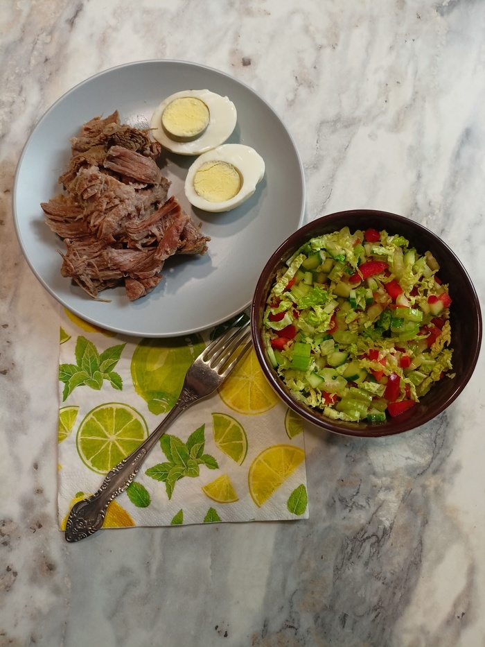 Ужин 200г отварной говядины. 2 варёных яйца и салат из свежей капусты на растительном масле