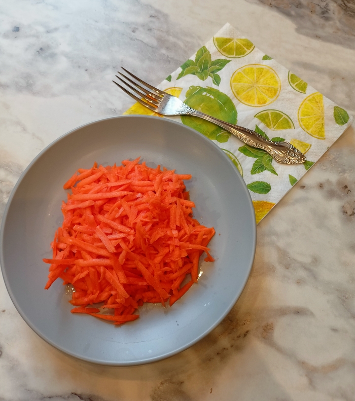 Ужин свежая небольшая морковка с растительным маслом и 2 варёных яйца