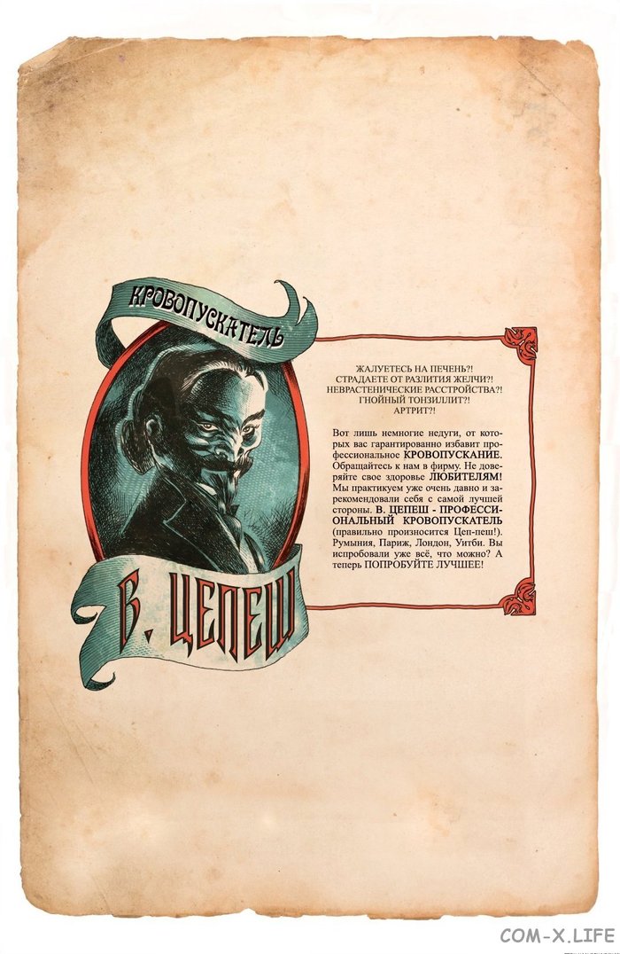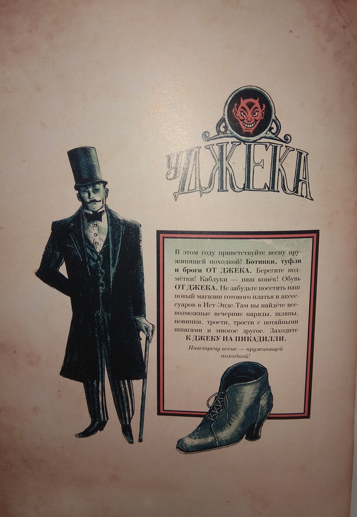 "Надоело есть жесткие отбивные? Свинину проще выбросить, чем разделать? Тогда вам пора в МЯСНУЮ ЛАВКУ ДЖЕКА! Работаем в присутствии клиента. Неизменно превосходный результат. Ни единой жалобы за три года! Спешите в МЯСНУЮ ЛАВКУ ДЖЕКА! Забьем, освежуем, распотрошим и разделаем за пятнадцать минут. Для дам – особая скидка в МЯСНОЙ ЛАВКЕ ДЖЕКА В УАЙТЧЕПЛЕ! Скидки действуют с 31 августа по 8 ноября."