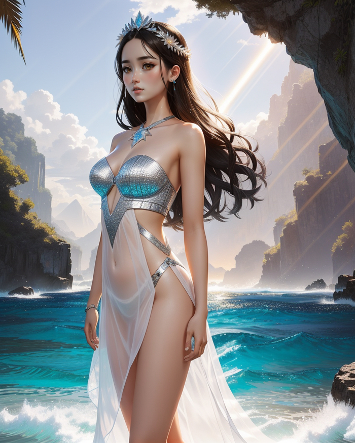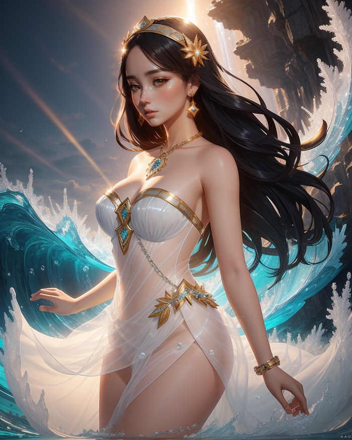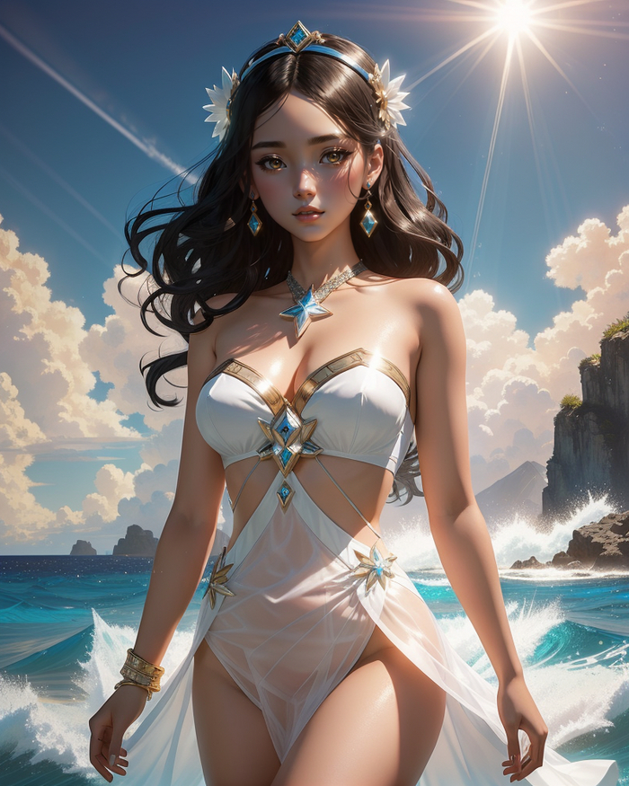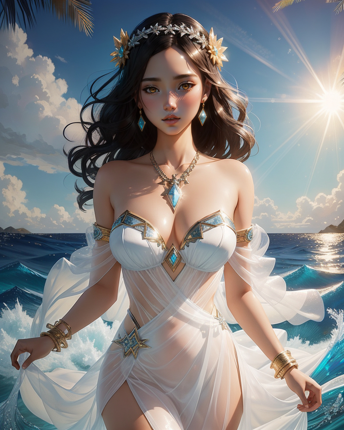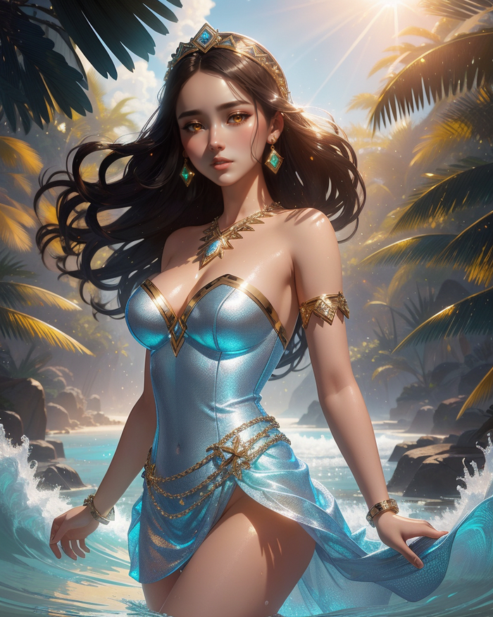 Promt: beautiful fashion elegant goddness of water, chic strapless dress, tropical sea background, character design, in the style of artgerm, and wlop, chanel jewelry, cinematic lighting, hyperdetailed, 8 k realistic, symmetrical, global illumination, radiant light, love and mercy, frostbite 3 engine, cryengine, dof, trending on artstation, digital art, crepuscular ray