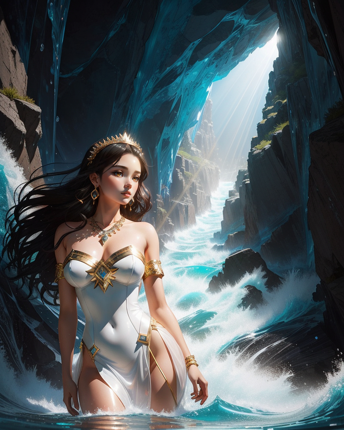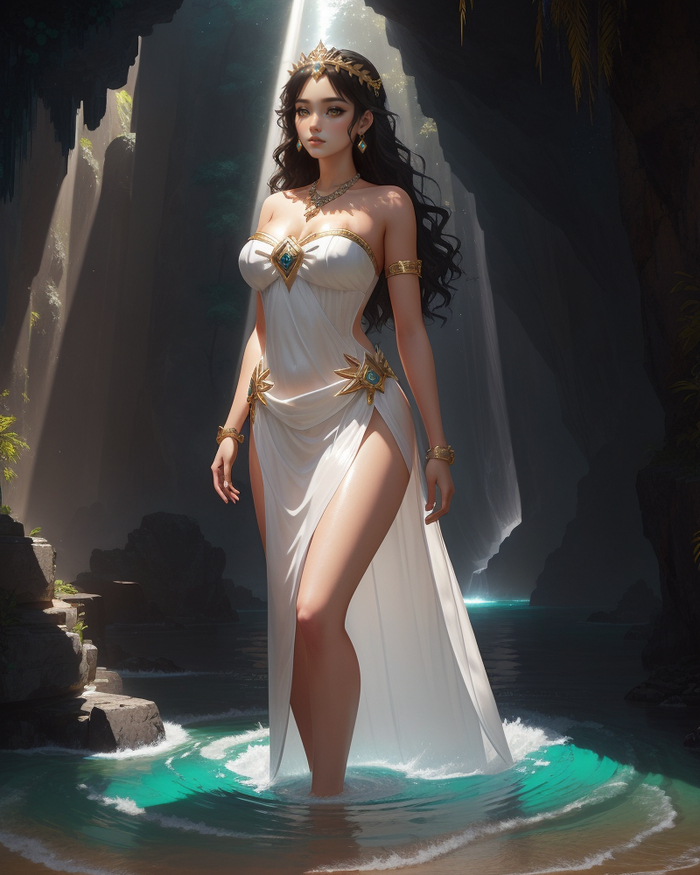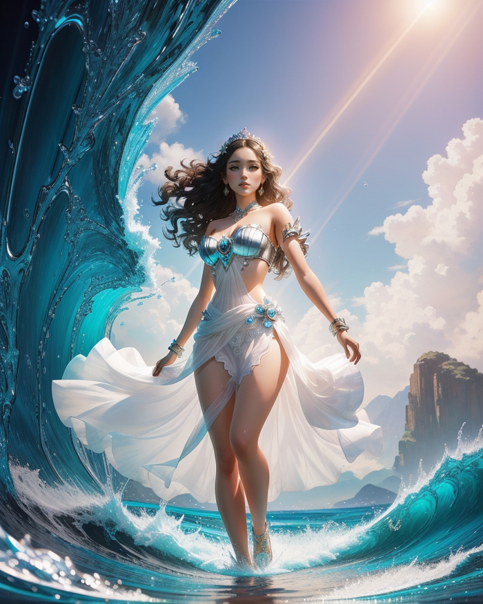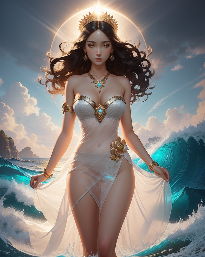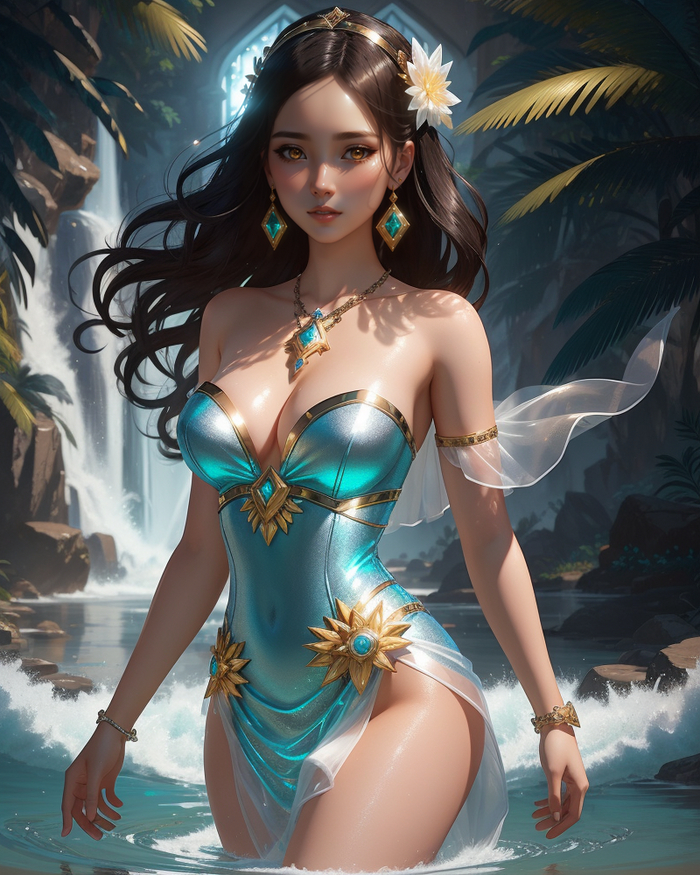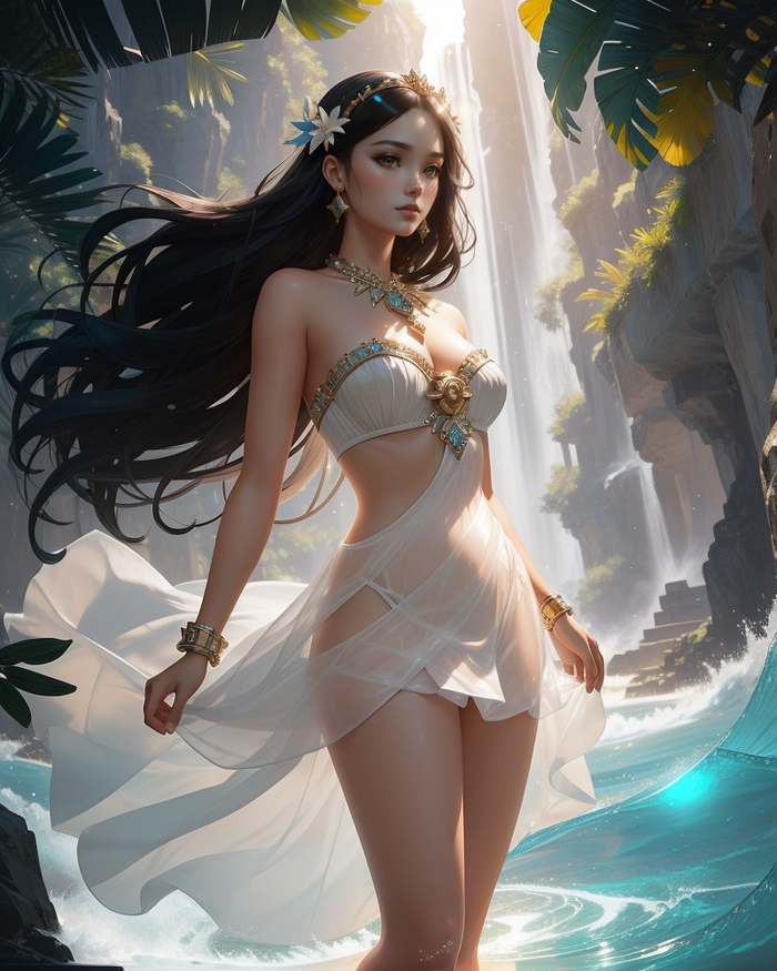 Promt: beautiful fashion elegant goddness of water, chic strapless dress, tropical sea background, character design, in the style of artgerm, and wlop, chanel jewelry, cinematic lighting, hyperdetailed, 8 k realistic, symmetrical, global illumination, radiant light, love and mercy, frostbite 3 engine, cryengine, dof, trending on artstation, digital art, crepuscular ray