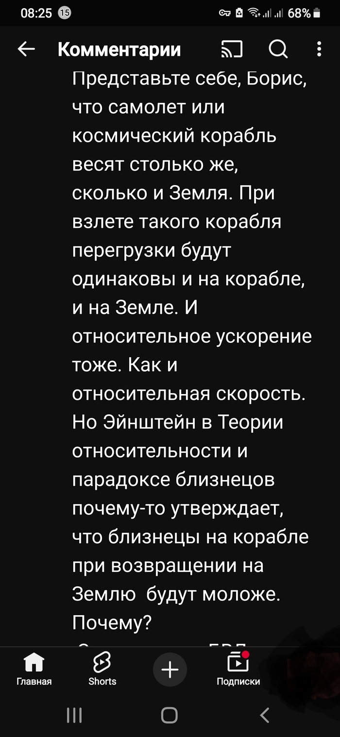 При этом я не смог найти ответ на свой вопрос о Парадоксе близнецов, который считаю неверным, по крайней мере до тех пор, пока кто-нибудь внятно не опровергнет мои доводы. Эти доводы я изложил учёному-физику Борису Бояршинову в комментариях на его канале. Сходу он их не опроверг, любезно пообещал сделать видео на эту тему. Всю переписку с ним я приводить не буду, приложу только скриншот моего последнего комментария, так сказать, на лестнице: