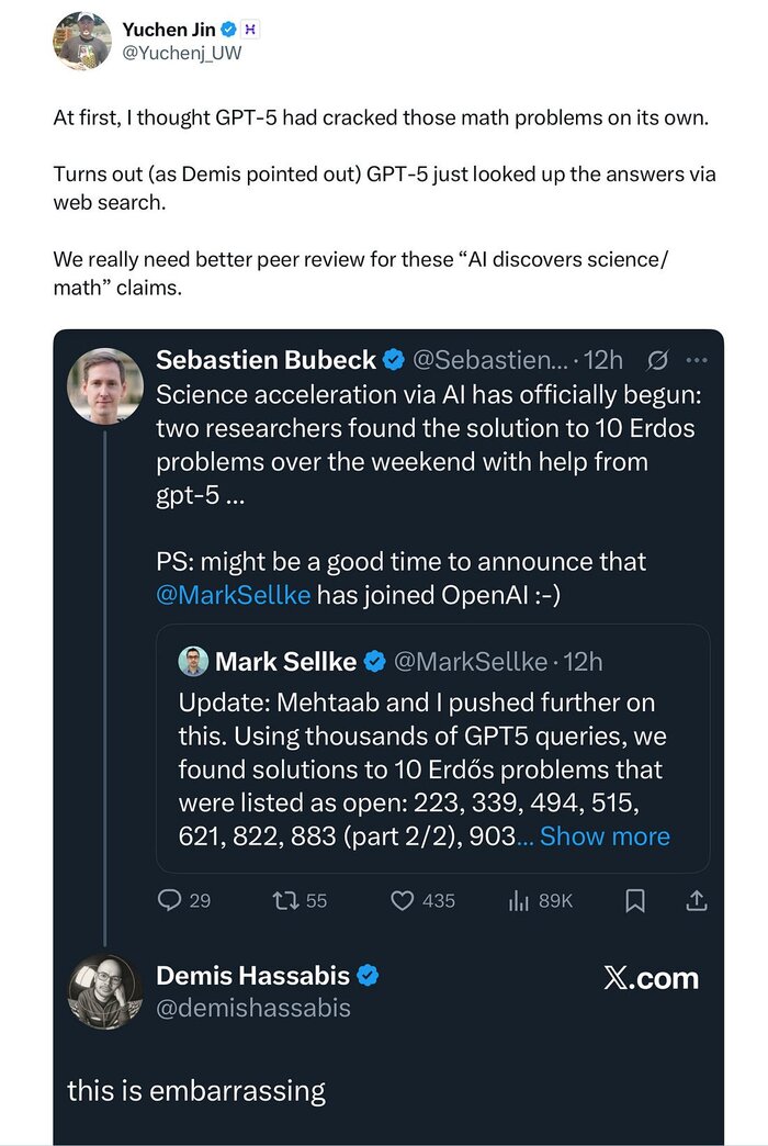 🐌 Конфуз недели OpenAI, над которым постебался даже глава AI-подразделения Google: полуфейковое научное открытие от GPT-5 (написал детали вот в этом посте у себя на канале).