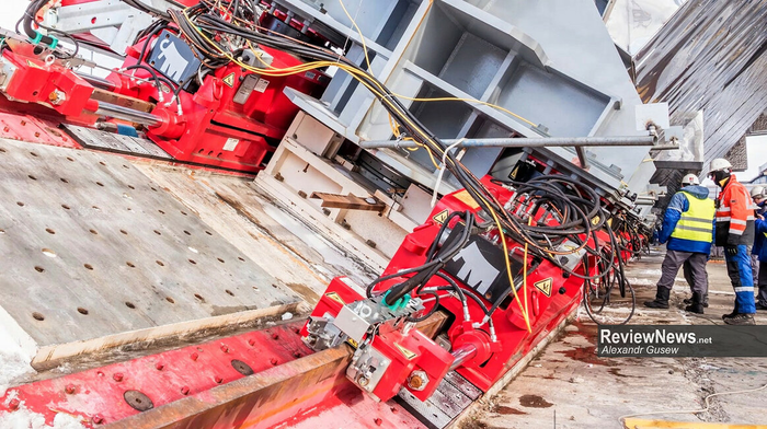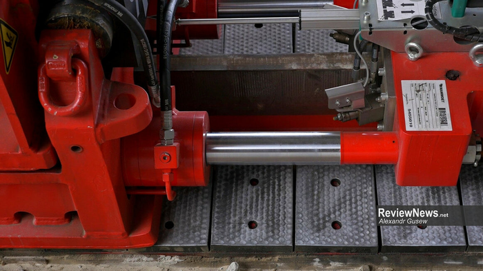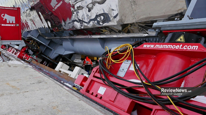 На снимках показано как происходил процесс передвижения конструкции по средствам гидравлических домкратов. Сама конструкция двигалась по направляющим.