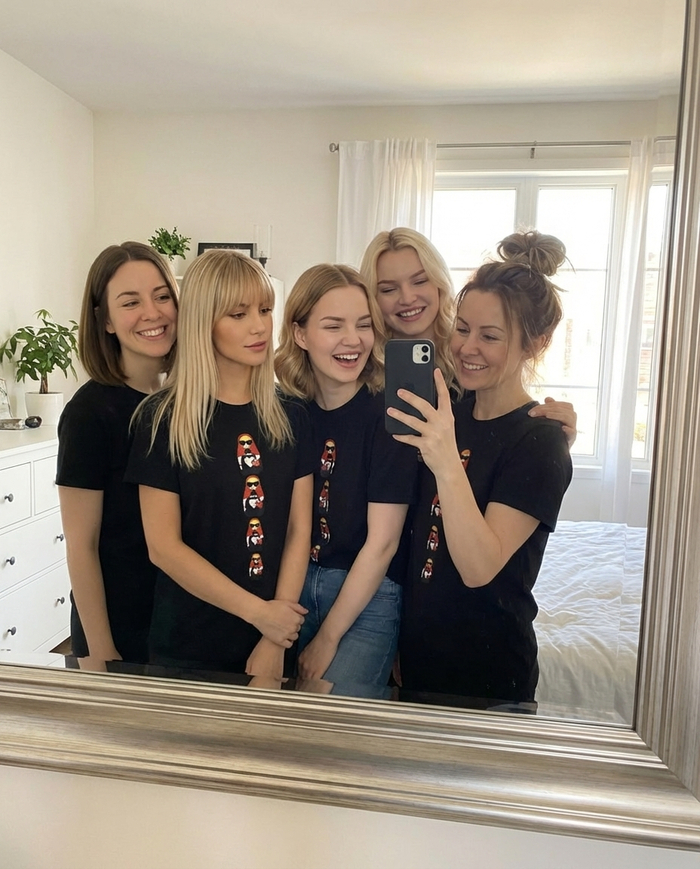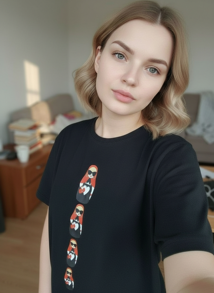 Я искала обычную чёрную футболку: без надписей, без блёсток, просто нормальную базовую вещь. И вдруг вижу - матрёшка. Но не традиционная, а такая… хулиганистая: очки, красная помада, уверенный вид. Не знаю почему, просто щёлкнуло. Нажала «в корзину» даже без привычных раздумий «а надо ли».