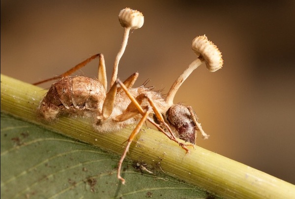Грибок-паразит называется кордицепс всего есть 6 видов, нам интересен кордицепс однобокий. Он есть по всему миру, но в основном обитает в тропических джунглях. Он заражает насекомое, медленно ест его и захватывает его разум, застваляет жертву доставить грибок в подходящие для жизни паразита условия, насекомое умирает, становится кормом.