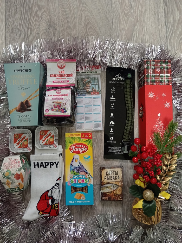 Когда я распечатывал каждый подарок, был приятно удивлен, что это то что мне нужно. Попугаи получили лакомство, я для рыбалки получил термос, браслет 4в1 (огниво, компас, свисток и жгут) и карты. Также я получил чай(который я сразу заварил) сладости для чая, и предсказание, которое звучит так "Любая дверь будет открыта для тебя в Новом году".