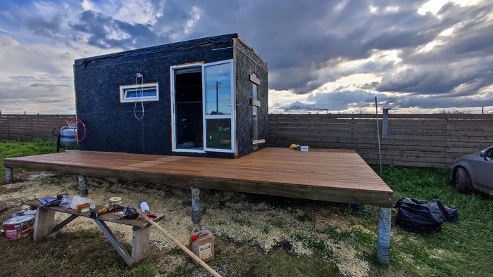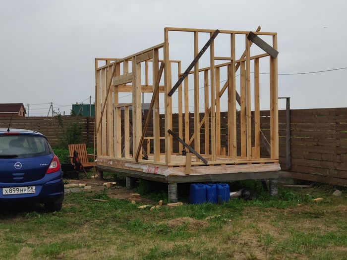 Для работы на участке решил сделать бытовку, размеры 2.5*5 по каркасной технологии. Без утепления так лишь бы была крыша над головой. Фасад из Осб под покраску и не больше, но что то пошло не так).