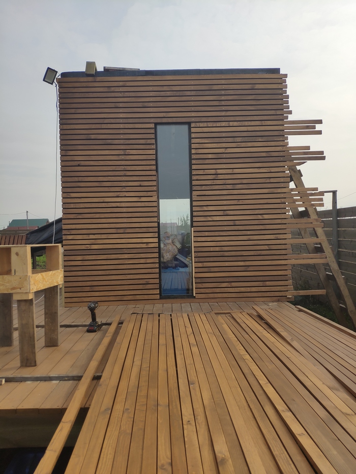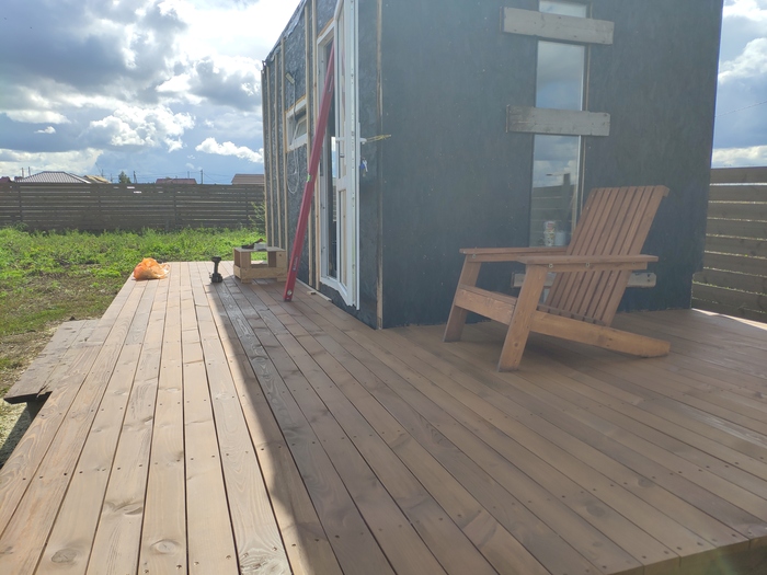 Терраса на таком же фундаменте только 100 мм диаметре. Пол террасы отшлифован и покрыт маслом так же как и рейка для фасада