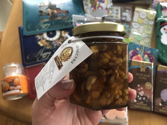 Смотрите, какая красота - мед с орешками! Никогда такого не видела и не пробовала. Еще была баночка с миндалем :)
