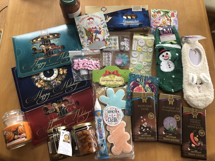 Тут полное попадание в интересы - мимимишные носочки с зайчиками и снеговиками, штуки для скрапбукинга и огромная куча вкуснях.