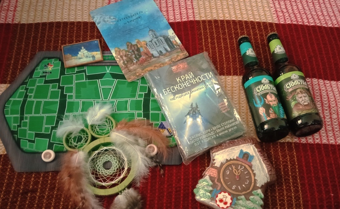 Всё вместе (книга в жанре фантастики, путеводитель по городу Владимир, новогодний пряник, магнит, ловец снов, что-то алкогольное под названием столбуха и коврик для спидкубинга):