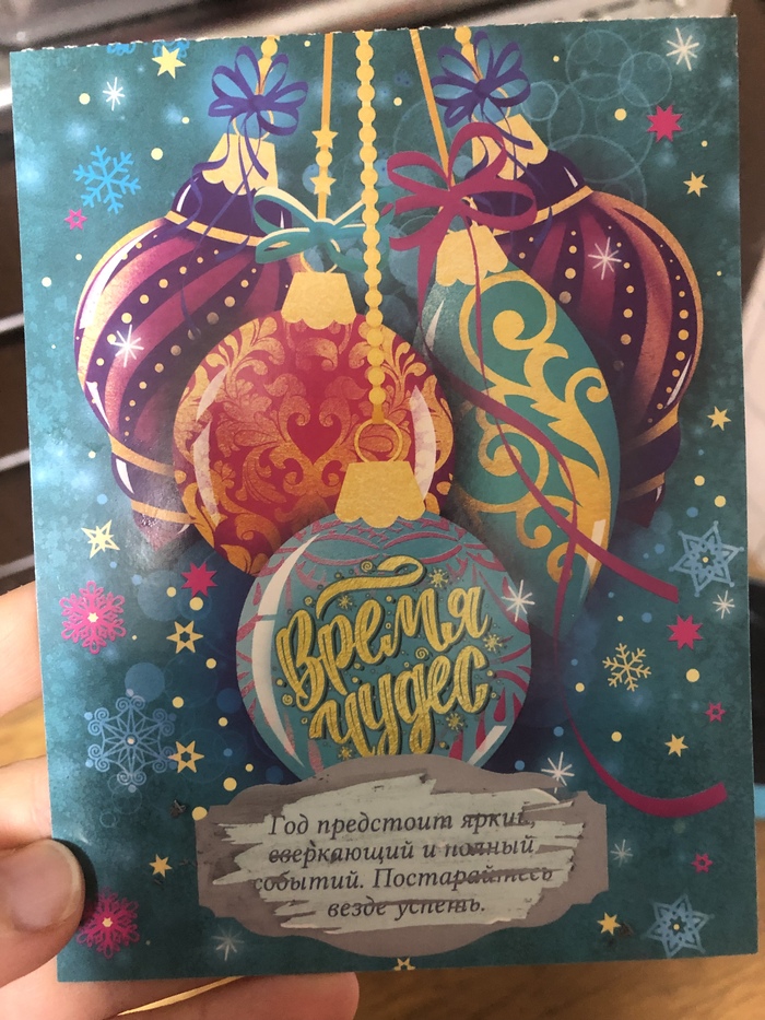 К каждому подарку была красивая подписанная открытка-предсказание. Стираешь слой монеткой и читаешь очередную милость :)))