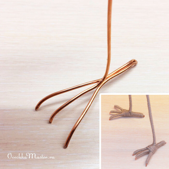 Длинная проволока для ноги, переходящей в центральный палец (длину ног делаете на свое усмотрение). А маленький кусочек проволоки - это два крайних пальца и задний палец.